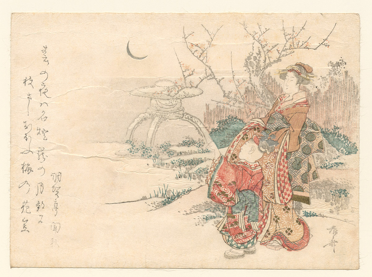 Title Courtesan and a child in a garden viewing a crescent moon