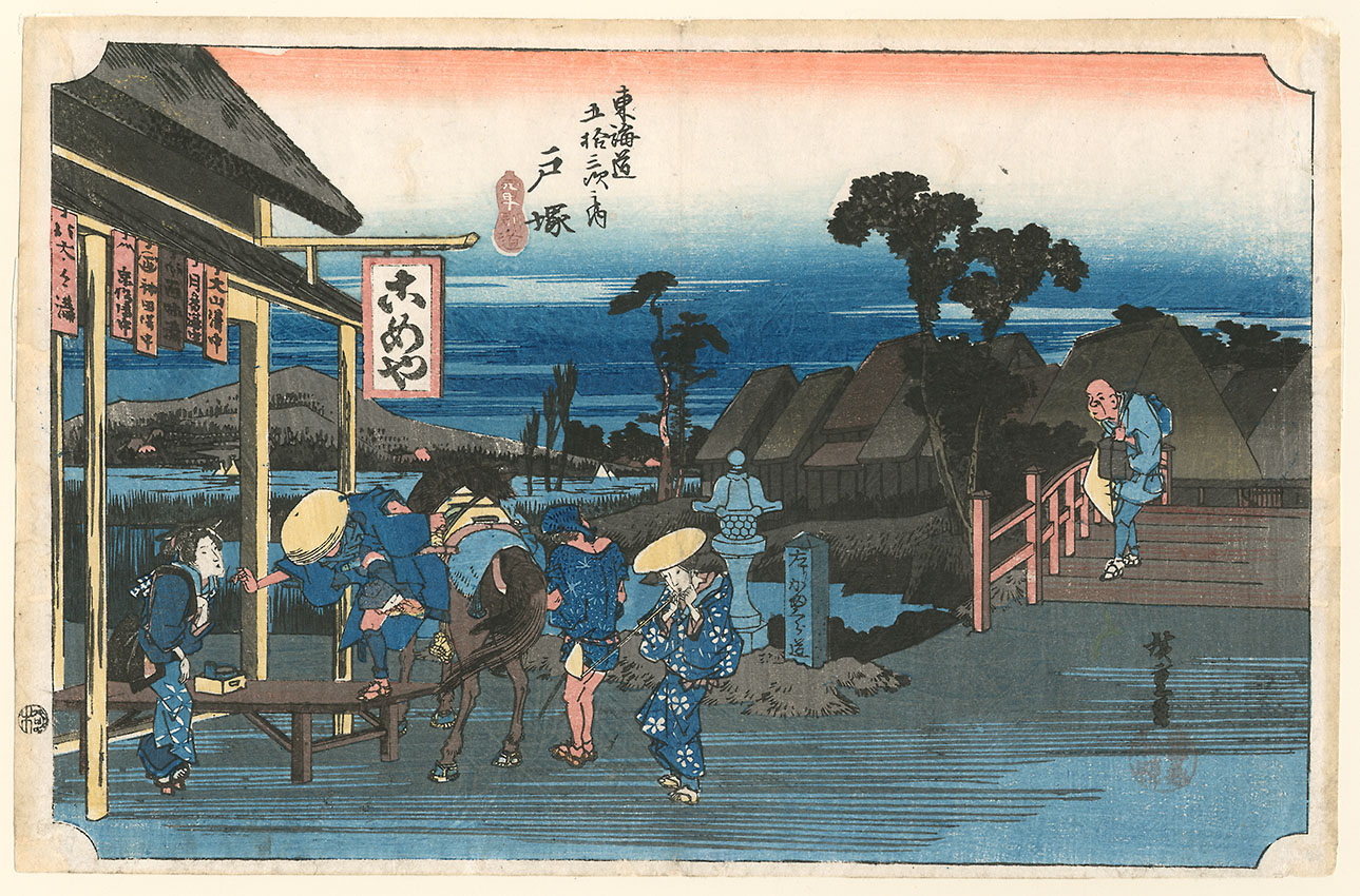 Hiroshige tinkered with the designs of this series and there is another version of this station where the rider is mounting the horse! Very slight centerfold, no backing
